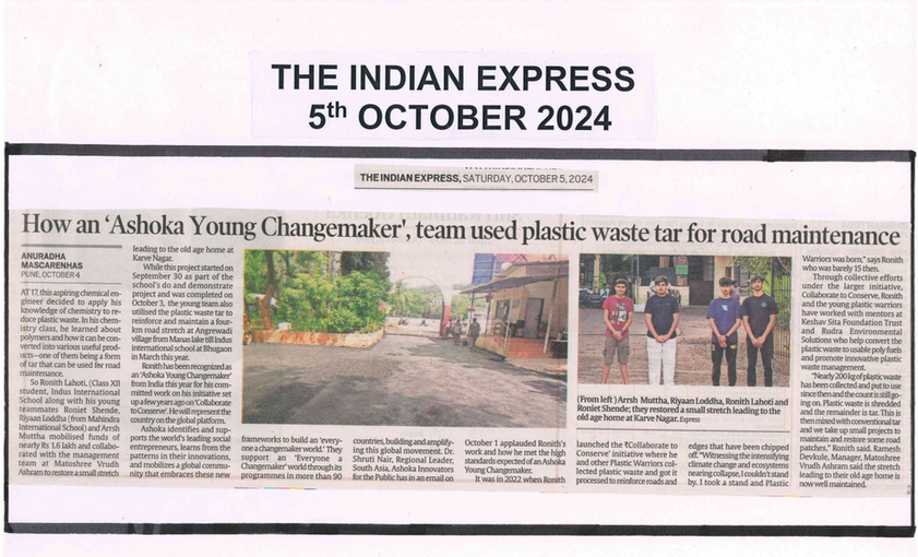 But we're not stopping there! We've embarked on a groundbreaking project to repair a 4 km stretch of road using Plastic Waste Tar, from Angrewadi Village to Indus International School. Collaborating with students like Riyan Lodha from Mahindra International School and Vivaan Ranka from Symbiosis International School, we're showing that noble actions can spark change.