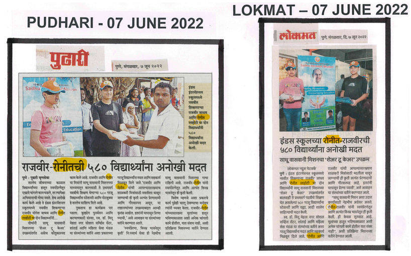 On June 3, 2022, launched the 'Share to Care Education Drive' in collaboration with Sadhu Vaswani Mission at Indus International School, Pune. Our goal was to enhance educational resources for students from Junior KG to First Year graduates by providing essential study materials like stationery and notebooks to over 580 school students. We received invaluable support from organizations like the Leprosy Rehabilitation and Welfare Organization, Late Dr. Minu Mehta Nagar Social Service Center, Shantai, and Mahila Seva Mandal. With 2.8 Lakhs raised from Sadhu Vaswani Mission, we're inspired to continue our mission of serving others.